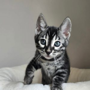 Edison is a tiny, spotted spark of pure invention. His wild, marbled coat ripples over a frame of coiled springs and boundless curiosity. With bright, intelligent eyes, he deconstructs his world—testing the bounce of a spring, the roll of a bottle cap. Every leap is a calculated experiment, every pounce a new discovery. He is a whirlwind of soft fur and brilliant energy, a little genius whose purr is the satisfying hum of a successful, mischievous experiment.