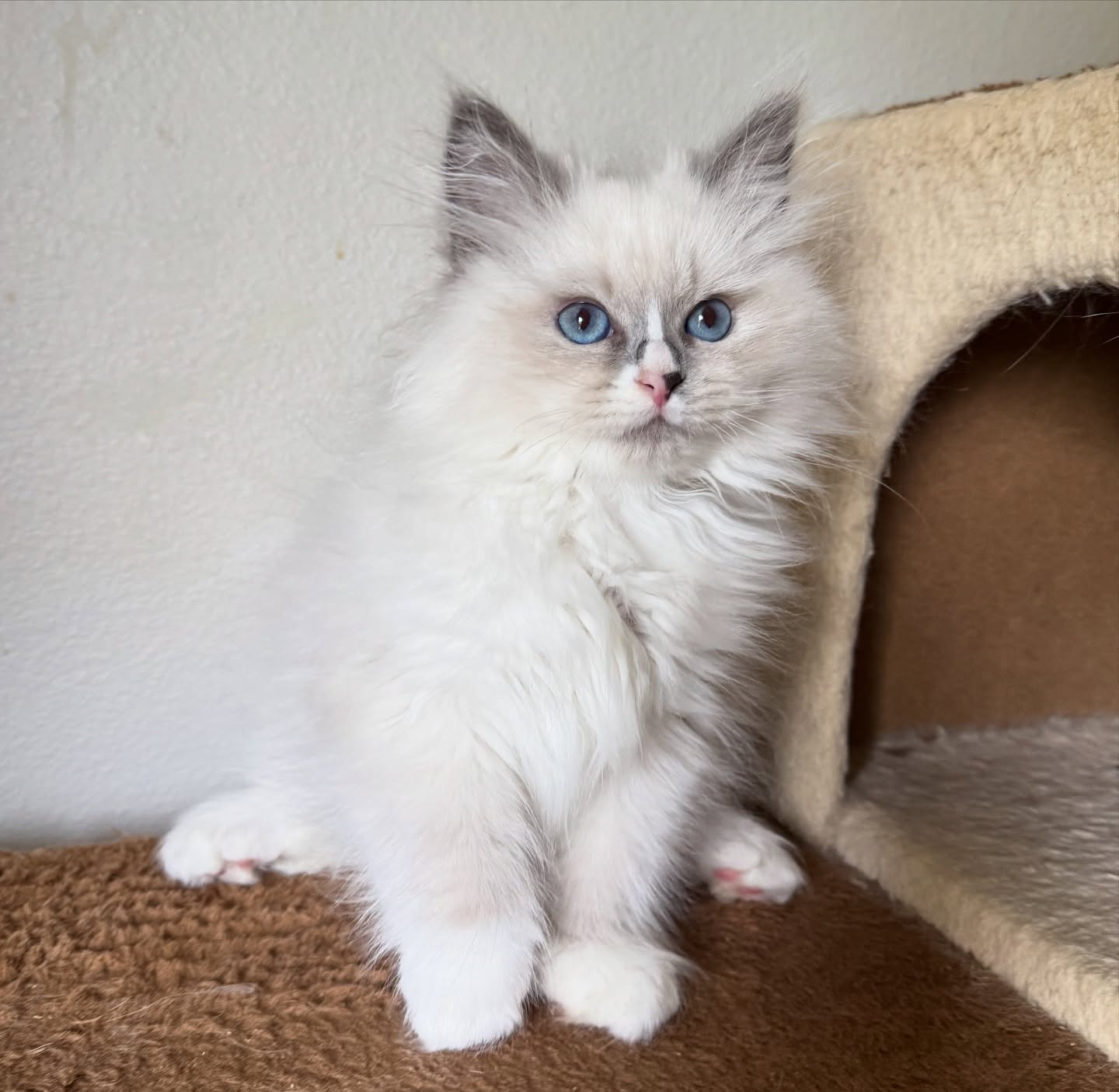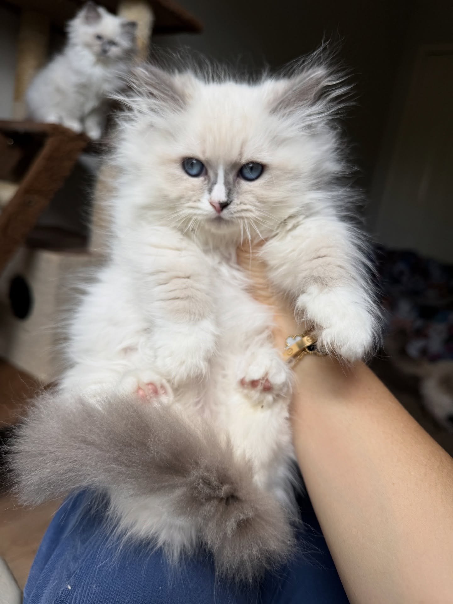 Lilly is a vision of winter-kissed fluff, a blue-eyed princess from a Siberian fairy tale. Her luxuriant, triple-layered coat is a cascade of softest fur, framing a face of sweet innocence and wild grace. She moves with a quiet, delicate power, exploring her domain with curious pats of her snowshoe paws. Her purr is a soft, melodic hum, a sound as gentle as falling snow, promising a heart full of loyal affection and playful, woodland magic.