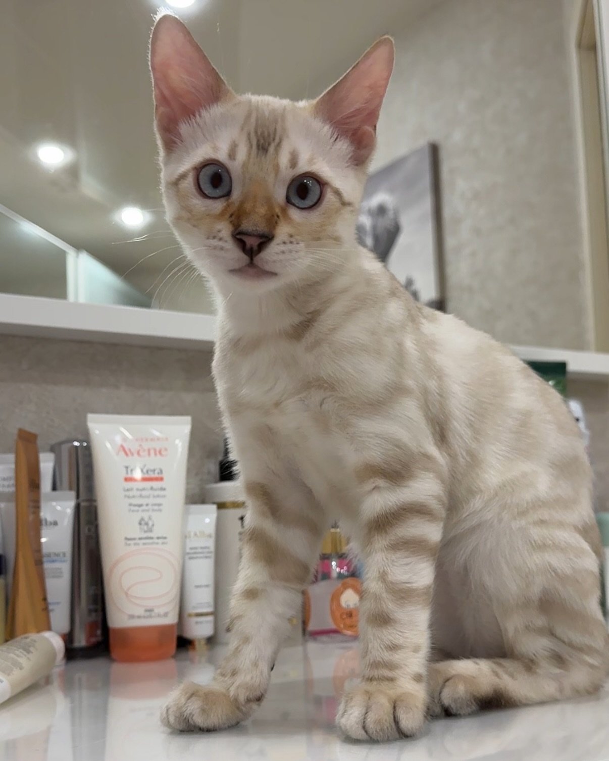 Nala is a golden-eyed queen, her sleek, rosette-spotted coat a testament to her wild lineage. She moves with a liquid, predatory grace, a miniature huntress surveying her sun-drenched domain from the highest perch. A powerful leap carries her effortlessly across rooms, a blur of spotted muscle and boundless energy. Yet, for her chosen pride, she reserves a deep, thrumming purr, nuzzling with a devotion as fierce as her spirit. She is both wild royalty and a fiercely loyal companion.
